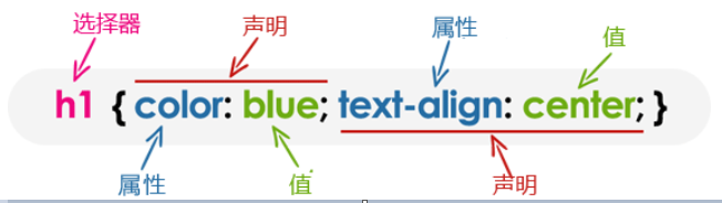 • 块内的声明决定了元素在网页上的格式。每个声明都包含一个属性和一个值,这些值和值之间用冒号(:)分隔并以分号(;)结尾,并且声明组用花括号括起来{}