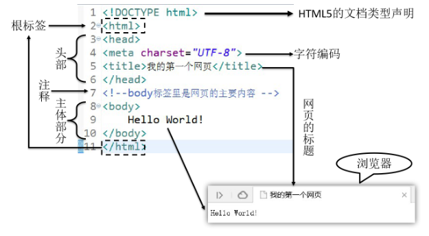 HTML文件中第一行的内容,用来告诉浏览器当前HTML文档的基本信息,其中最重要的就是当前HTML文档遵循的语法标准。这里我们只需要知道HTML有4和5这两个大的版本,HTML4版本的文档类型声明是: