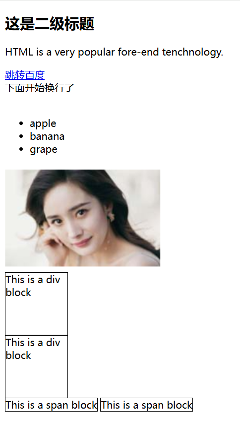 | div | 定义一个前后有换行的块 | 【块】并不是为了显示文章内容,而是为了方便结合CSS对页面进行布局。块有两种,div是前后有换行的块,span是前后没有换行的块。 |